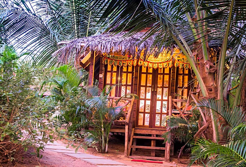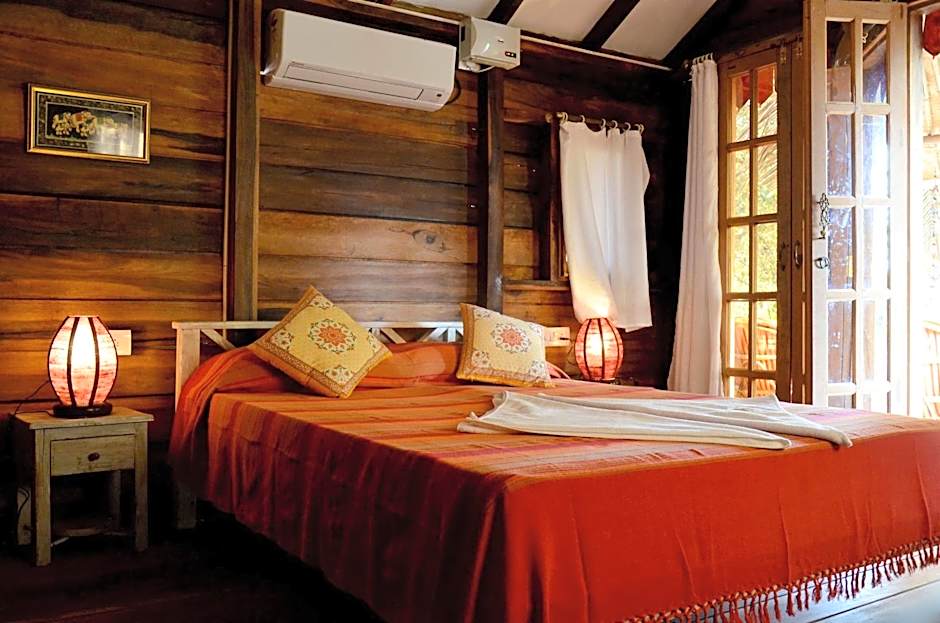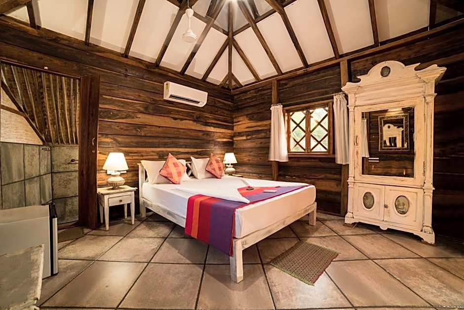This tropical wooden cottage has decorative interiors, a balcony, tile/marble flooring and electric kettle.